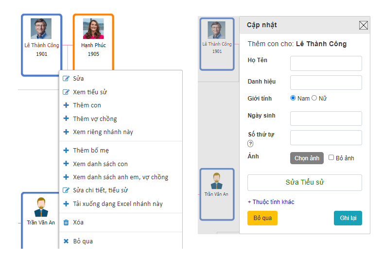 • Thêm thành viên, thêm con cái, vợ chồng, bố mẹ, thêm vợ (chồng) cả, vợ 2, vợ 3...